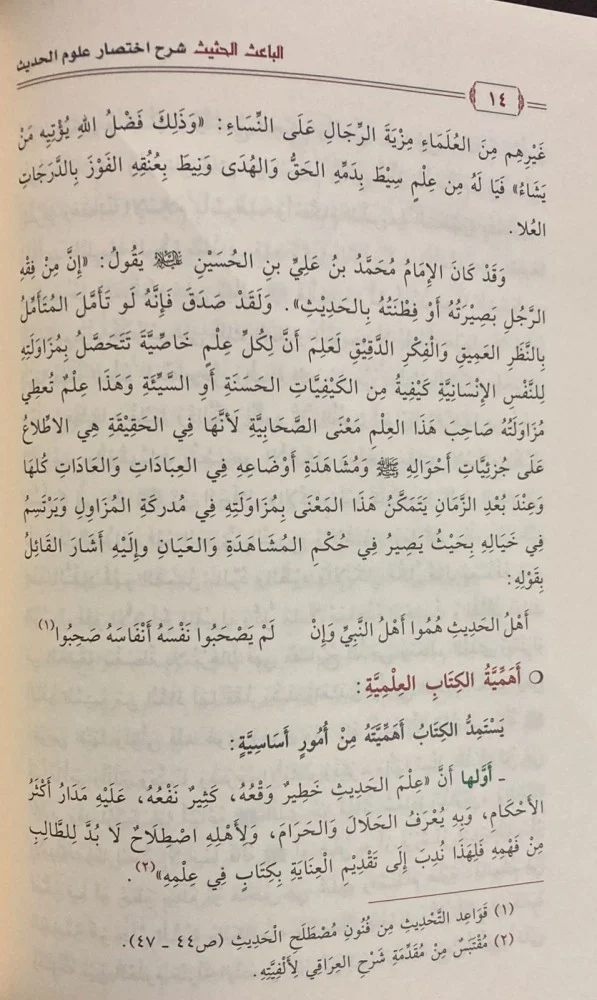 - أَوَّلها أَنَّ عِلْمَ الحَدِيثِ خَطِيرٌ وَقْعُهُ ، كَثِيرٌ نَفْعُهُ عَلَيْهِ مَدَارُ أَكْثَرُ الأَحْكَامِ، وَبِهِ يُعْرَفُ الحَلَالَ وَالحَرَامَ، وَلِأَهْلِهِ اصْطَلَاحُ لَا بُدَّ لِلطَّالِبِ