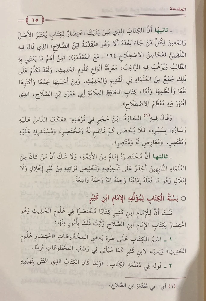 - ثانيهَا أَنَّ الكِتَابَ الذِي بَينَ يَدَيْكَ اخْتِصَارُ لِكِتَابِ يُعْتَبَرُ الأَصْلَ وَالمَعينَ لِكُلِّ مَنْ جَاءَ بَعْدَهُ أَلَا وَهُو مُقَدَّمَةُ ابْنُ الصَّلاحِ الذِي قَالَ فِيه البُلْقِينِيُّ مَحَاسِنَ الاصْطِلاح ١٦٤ - مَعَ المُقَدِّمَةِ): مِنْ أَهَمِّ مَا يَعْتَنِي بِهِ الطَّالِبُ وَيُرَغْبَ فِيهِ الرَّاغِبُ، مَعْرِفَةُ أَنْوَاعِ عُلُومِ الحَدِيثِ. وَلَقَدْ تَكَلَّمَ عَلَى ذَلِكَ جَمْعٌ مِنَ العُلَمَاءِ فِي الْقَدِيمِ وَالحَدِيْثِ، وَمِنْ أَحْسَنِهَا جَمْعًا وَأَكْثَرِهَا نَفْعًا وَأَعْظَمِهَا وَقْعًا، كِتَابِ الحَافِظ العلّامَةِ أبِي عَمْرُو ابْنِ الصَّلَاحِ الذِي أَظْهَرَ فِيهِ مُعْظَمَ الِاصْطِلاحِ». وَقَالَ فِيهِ (۱) الحَافِظُ ابْنُ حَجَرٍ فِي نُزْهَتِهِ: «عَكَفَ النَّاسُ عَلَيْهِ وَسَارُوا بِسَيْرِهِ، فَلَا يُحْصَى كَمْ نَاظِمِ لَهُ وَمُخْتَصِرٍ، وَمُسْتَدرِكِ عَلَيْهِ وَمُقْتَصِرٍ، وَمُعَارِضِ لَهُ وَمُنْتَصِرٍ».