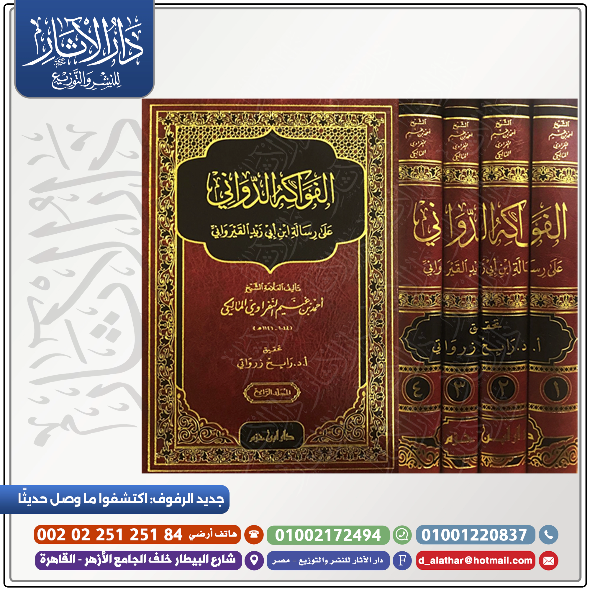 هل تبحث عن مصدر شامل ومعتمد لتعمق معرفتك في الفقه المالكي؟ لا تفوت فرصة اقتناء كتاب الفواكه الدواني على رسالة ابن أبي زيد القيرواني للمؤلف احمد بن غنيم بن سالم بن مهنا النفراوي، والذي تم تحقيقه من قبل رابح زرواتي. هذا الكتاب يعد مرجعاً هاماً لكل طالب علم ومحب للفقه.