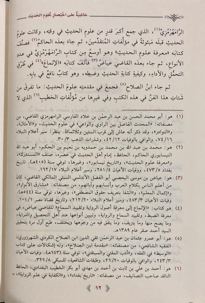 الرَّامَهُرْ مُزِي ) ، الذي جمع أكبر قدر من علومِ الحديث في وقته، وكانت الحديثِ قبله مبثوثة في مؤلَّفاتِ المُتقدِّمينَ، ثم جاء بعده الحاكم (۲) فصنف كتابه «معرفة علوم الحديثِ وهو أوسعُ من كتابِ الرَّامَهُرْمُنِي في عددٍ الأنواع، ثم جاء بعده القاضي عياض (۳) فألف كتابه «الإلماع» (٤) في طرق