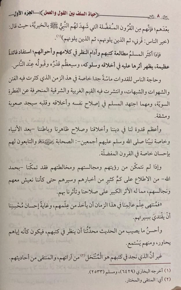 لحياة السلف بين القول والعمل الجزء الأول بعْدَهم؛ فإنَّهم مِن القُرُون المُفضّلة التي شَهِدَ لَهُم النَّبِيُّ صلى الله عليه وسلم بالخيريَّة، حيث قال:
