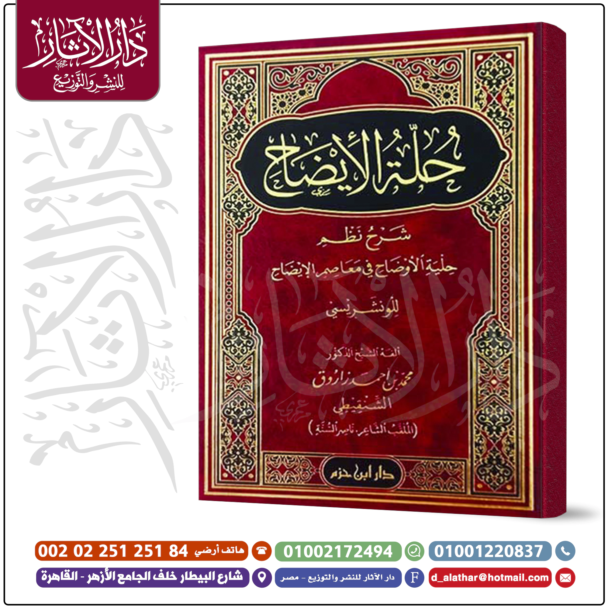 كتاب "حلة الإيضاح شرح نظم حلية الأوضاح في معاصم الإيضاح للونشريسي" هو شرح موسع لنظم حلية الأوضاح من تأليف الونشريسي، والذي يعد من الكتب المهمة في فقه المعاملات و الفقه الإسلامي. هذا الشرح قدمه محمد بن أحمد زاروق الشنقيطي، وهو من العلماء المعروفين في فقه المالكية، حيث قدم تحليلًا دقيقًا وشاملاً للموضوعات التي يعالجها النص الأصلي للونشريسي.