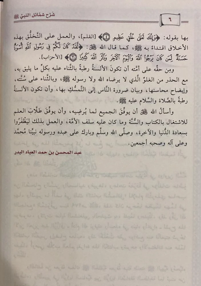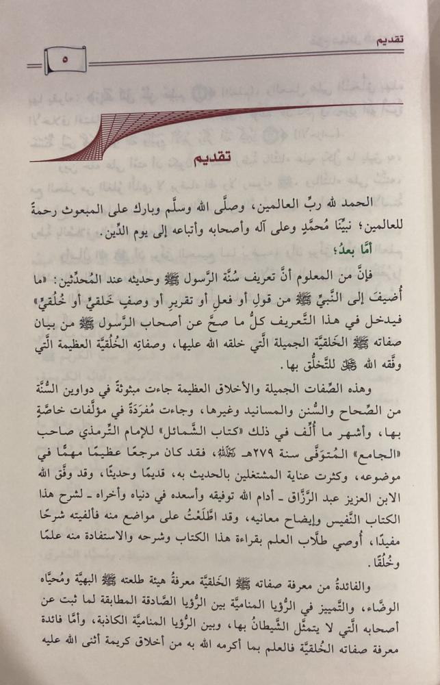 وهذه الصفات الجميلة والأخلاق العظيمة جاءت مبثوثة في دواوين السُّنَّة من الصحاح والسنن والمسانيد ،وغيرها وجاءت مُفرَدَةٌ في مؤلَّفات خاصة بها، وأشهر ما أُلف في ذلك كتاب الشَّمائل» للإمام الترمذي صاحب «الجامع» المُتوَفَّى سنة ٢٧٩هـ الله ، فقد كان مرجعًا عظيمًا مهما في موضوعه، وكثرت عناية المشتغلين بالحديث ،به قديمًا وحديثًا، وقد وفق الله الابن العزيز عبد الرَّزَّاق - أدام الله توفيقه وأسعده في دنياه وأخراه ـ لشرح هذا الكتاب النفيس وإيضاح معانيه وقد اطَّلَعْتُ على مواضع منه فألفيته شرحًا مفيدًا، أوصي طلاب العلم بقراءة هذا الكتاب وشرحه والاستفادة منه علمًا